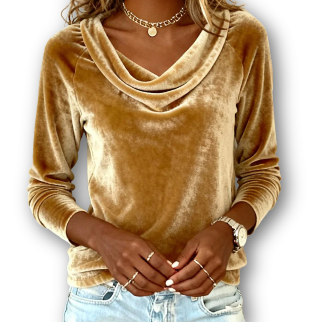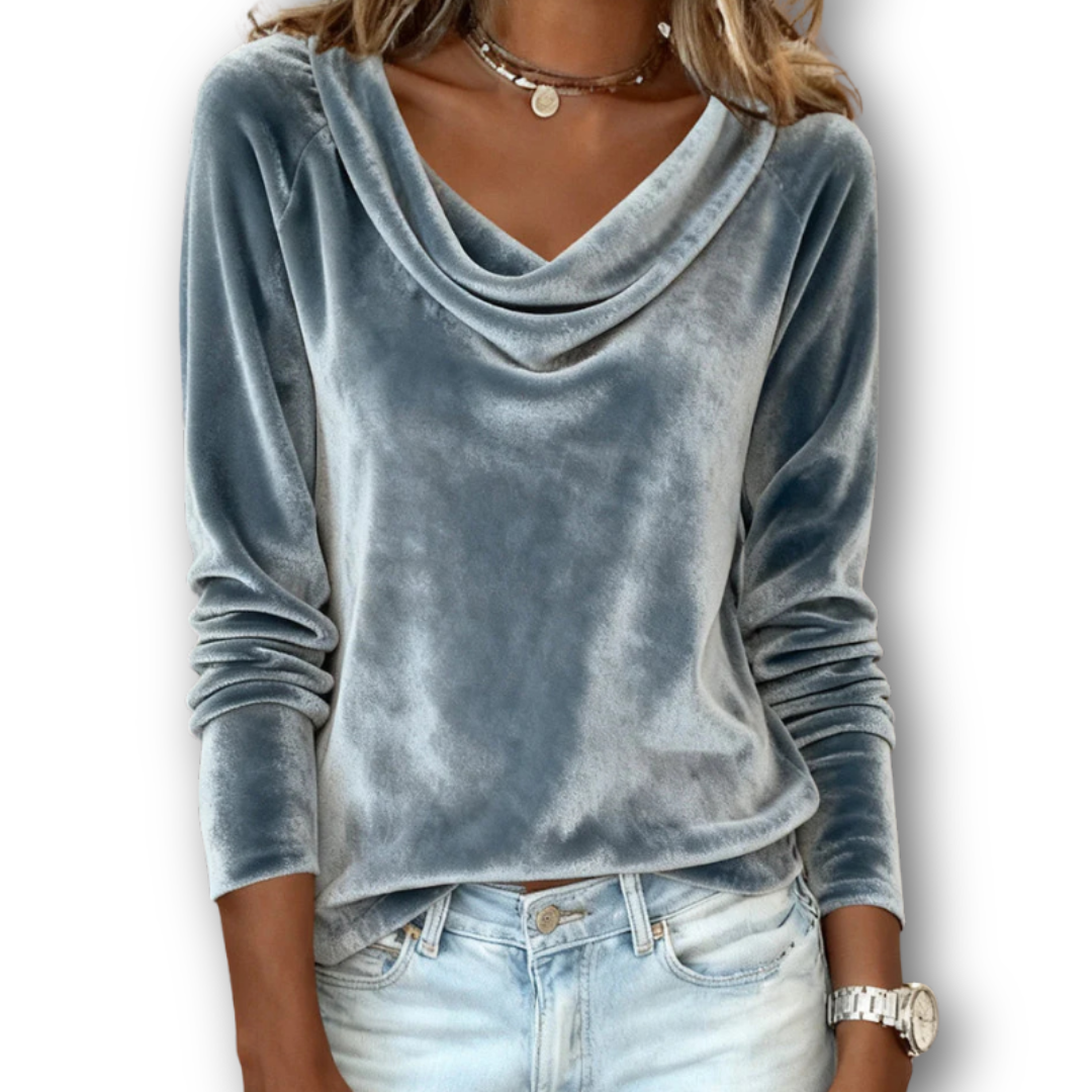 The Sophie long-sleeve velvet top combines relaxed elegance with exceptional comfort. The soft velvet feels gentle on the skin and drapes loosely without feeling restrictive. The draped neckline adds a feminine, polished touch and creates a beautiful flow around the shoulders and neckline.