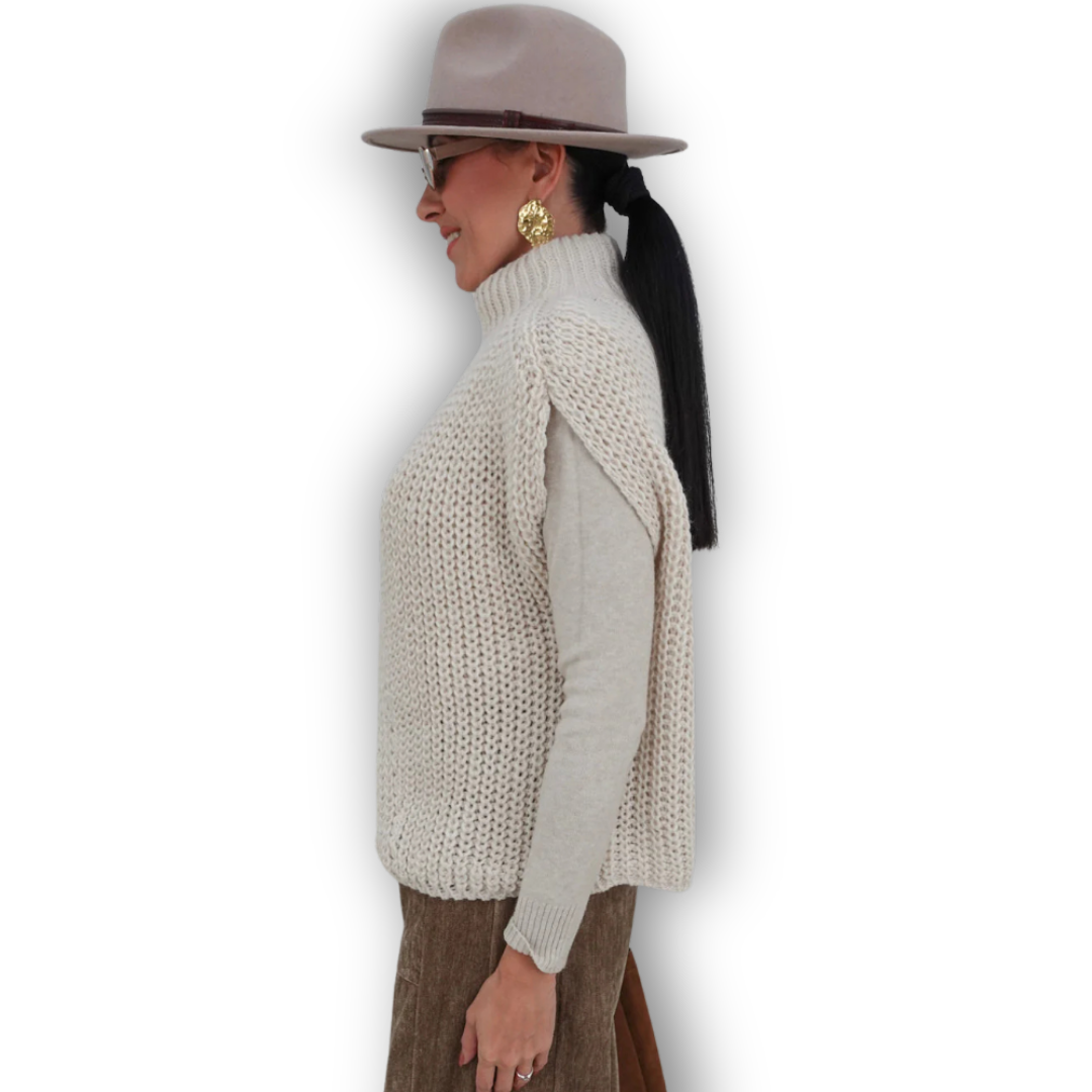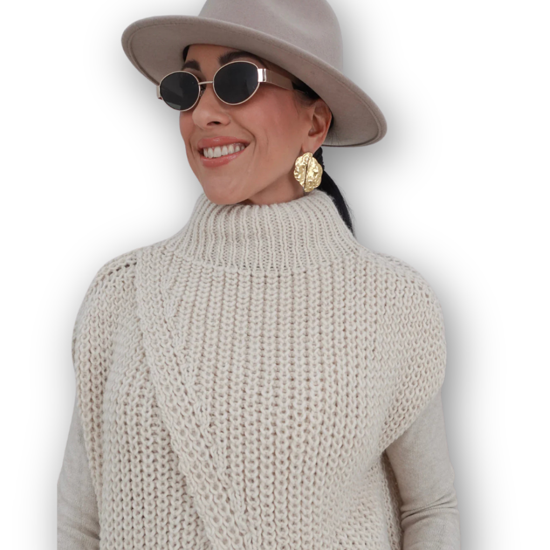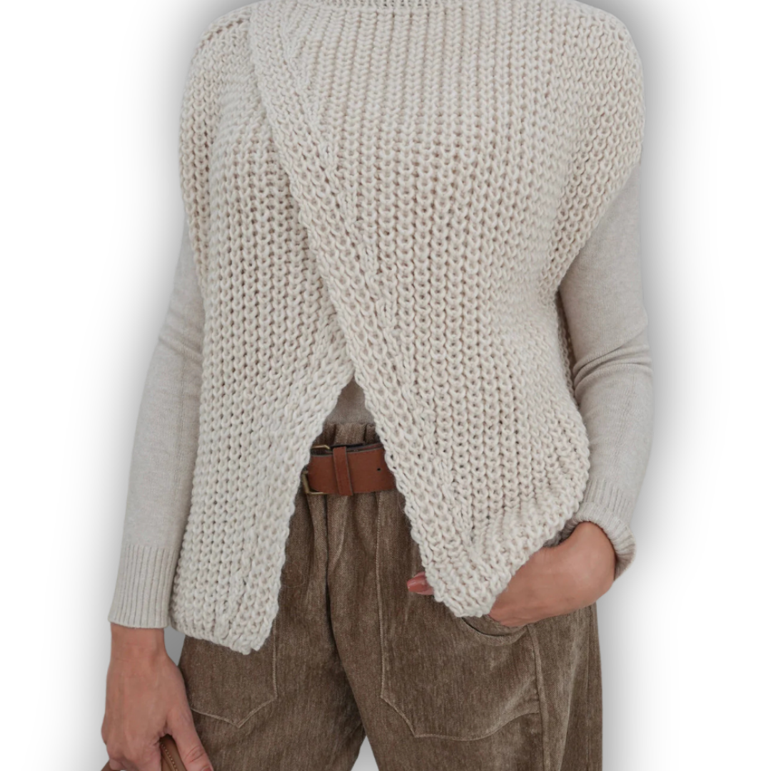Nero is a striking top with a crossover front and short sleeves. It is chunky knit and is one size fits all up to size 42. (Are you a size S to XL? Then this item will fit you!)
